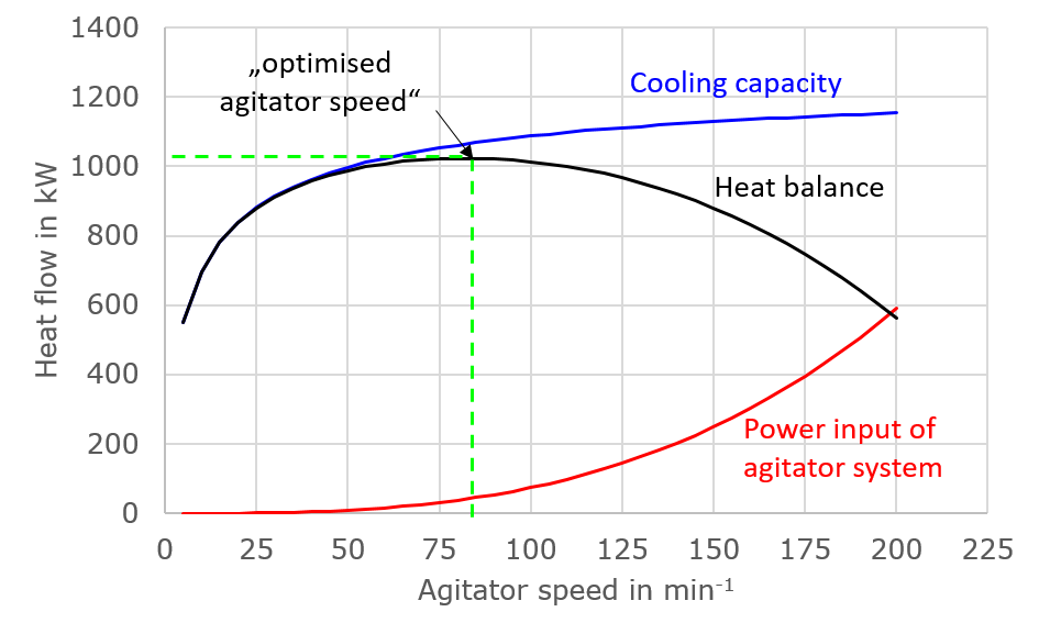 As described, in addition to the heat transport via the service media, a further power input (heat input) takes place via the agitator system. In the case of cooling via the service media, both aspects have an opposite effect. Both the cooling via the service media and the power input via the agitator system are speed-dependent and a maximum heat flow that can be dissipated is set as a function of the agitator speed - the optimised agitator speed.