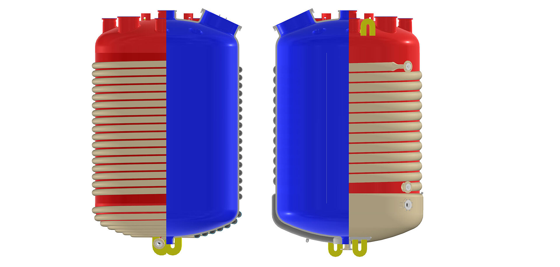 Emaillierte Reaktoren bzw. Rührbehälter weisen klassischerweise einen Doppelmantel mit Strömungsdüsen oder Halbrohrschlangen als Heiz- und Kühlräume auf. Die nutzbare Wärmeaustauschfläche wird dabei von der Behältergröße vorgegeben.