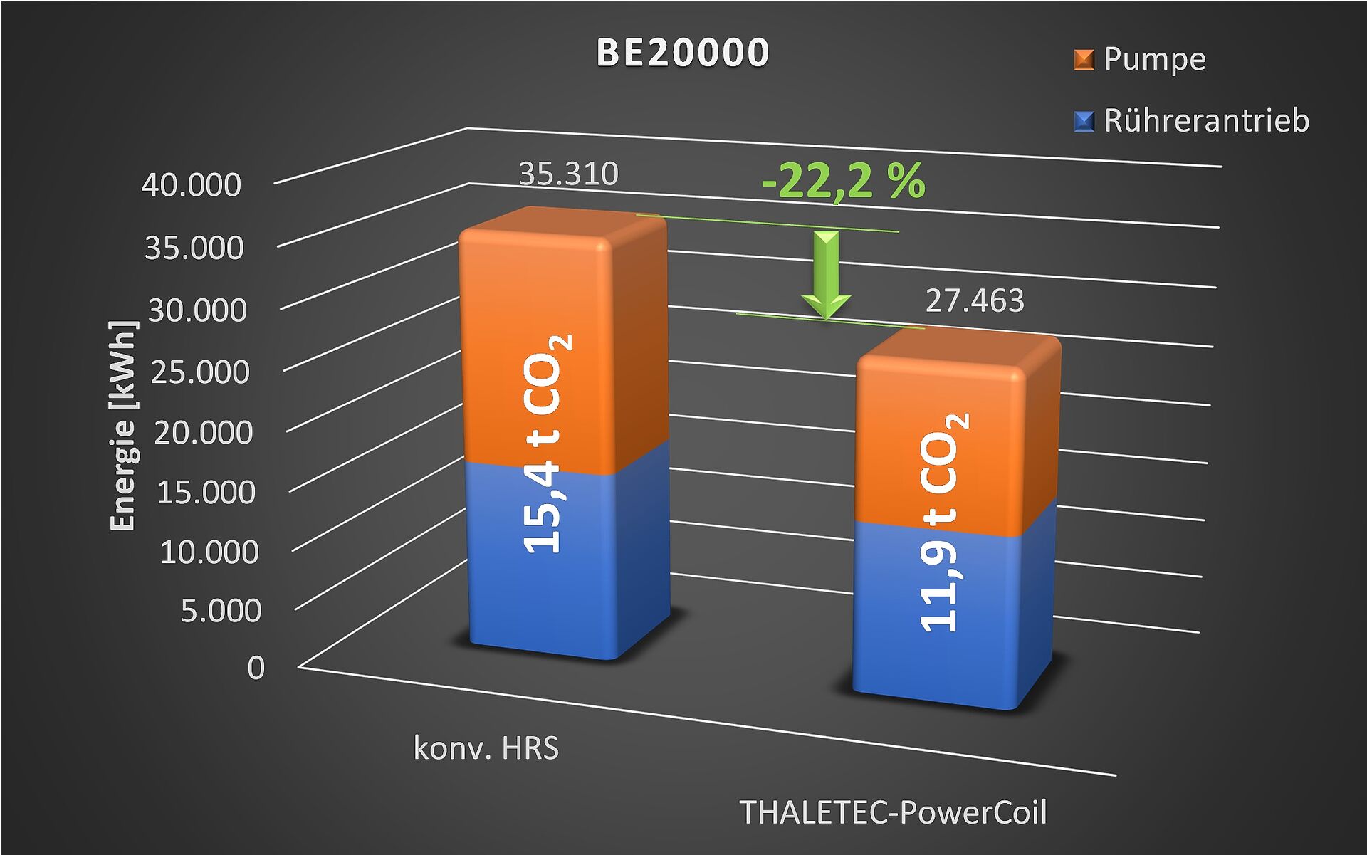 Abbildung 5: Exemplarischer Vergleich des Energiebedarfs und der CO2-Emissionen unter Berücksichtigung des niedrigeren Druckverlustes und der verkürzten Prozesszeit durch ein THALETEC-PowerCoil