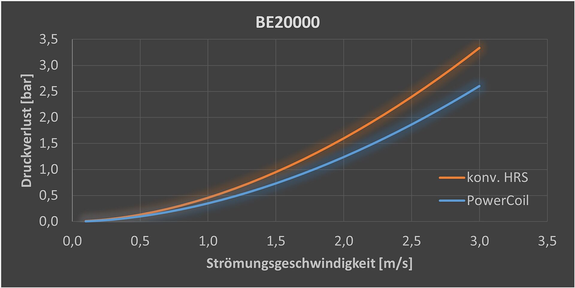 Abbildung 4: Vergleich des Druckverlustes eines BE20000 mit konventioneller Halbrohrschlange und mit dem THALETEC-PowerCoil in Abhängigkeit der Strömungsgeschwindigkeit im Serviceraum