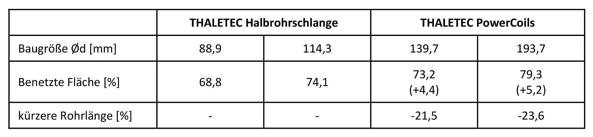 Tabelle 1: Vergleich konventioneller Halbrohrschlangen von THALETEC und Wettbewerbern zu den neuen PowerCoils