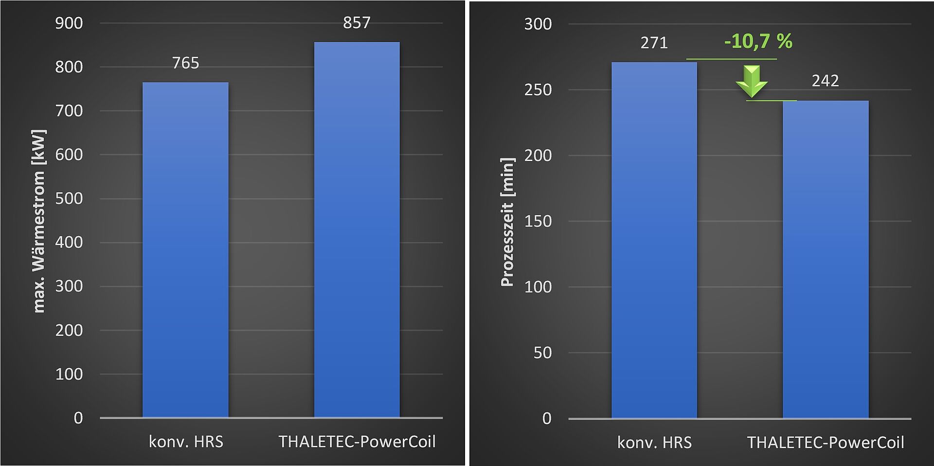Abbildung 3: Vergleich der Wärmeleistung (links) und der Prozesszeit (rechts) eines BE20000