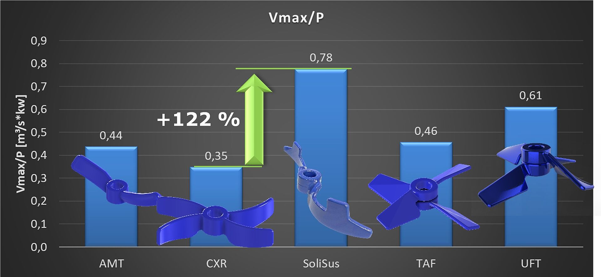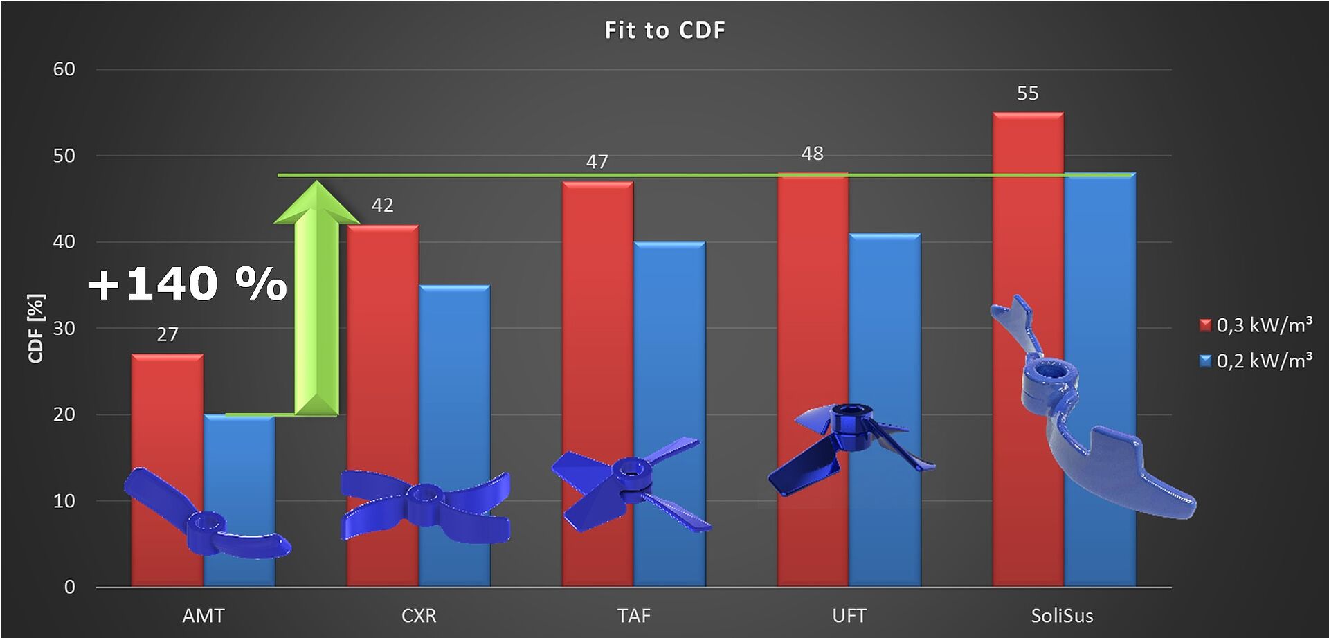 Umfangreiche numerische und experimentelle Analysen zeigen das überlegende Suspensionsverhalten der SoliSus gegenüber allen bisherigen Suspensions-Rührern auf. Partikel werden bis zu 88 % schneller aufgebwirbelt und die Qualität der Partikelverteilung ist bis zu +140 % höherwertiger bei gleichem Leistungseintrag (Abbildung 4).