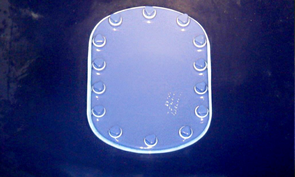 Abbildung 3 zeigt eine solch großes EmPad: Das Reparaturelement besitzt hier die Abmessungen 700x400 mm und wurde in einem 20.000 l Rührwerksbehälter eines Fremdherstellers installiert.