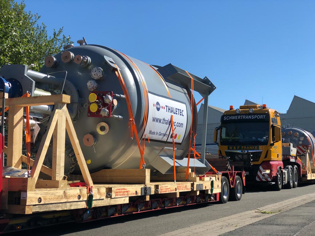 Ein Sondertransport war erforderlich, um die ersten drei einer Serie von emaillierten Rührbehältern der Bauform BE mit 16,000 l Volumen auf die Reise nach Taiwan zu schicken. Der Kunde, ein großes taiwanesisches Chemieunternehmen entschied sich vor knapp einem Jahr dazu, mehrere Rührbehälter von THALETEC zu kaufen.