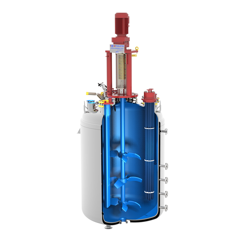 Die beschriebenen Untersuchungen bezogen sich auf Rührsysteme, bei denen eine Rührebene in gewissem Bodenabstand eingebaut ist. Eine weitere Verbesserung der Durchmischung kann man erzielen, wenn man mehrstufige Rührsysteme einsetzt. Auch hier haben sich Rührsysteme mit mehrstufigen DCX Turbinen bewährt. Abbildung 2 zeigt ein solches Rührsystem. Ein dreistufiger Rührer mit DCX Turbinen auf jeder Ebene sowie ein PowerBaffle anstelle eines herkömmlichen Stromstörers stellen energieeffizientes Suspendieren von Feststoffen und einen guten Wärmeübergang mit kurzen Heiz und Kühlzeiten sicher.