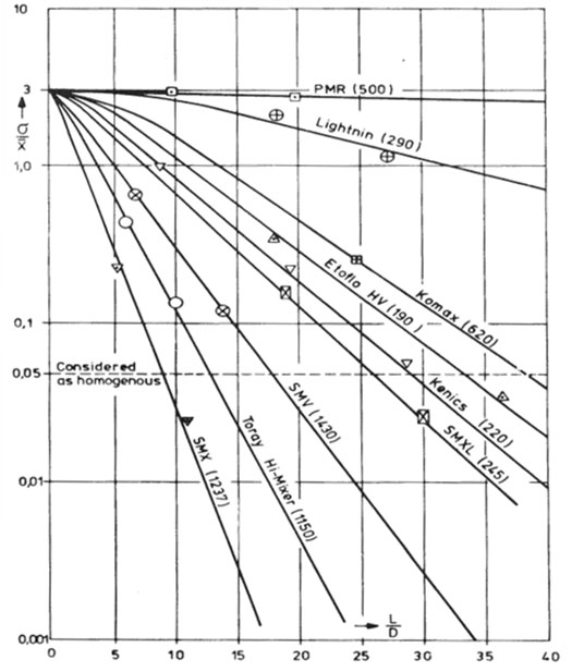 Über Diagramme wie in Abbildung 3 dargestellt, lassen sich ebenfalls die entsprechende Länge des statischen Mischers für die gewünschte Homogenität ablesen. Die Länge hängt ebenfalls von den Stoffeigenschaften ab. Wie bereits beim leeren Rohr verändern sich Mischeigenschaften sobald die Reynolds Zahl verändert wird. Turbulente Strömungsbedingungen führen zu kurzen Mischern, während laminare Bedingungen mischen durch mehrfaches umschichten erfordern und diese dadurch länger sind.