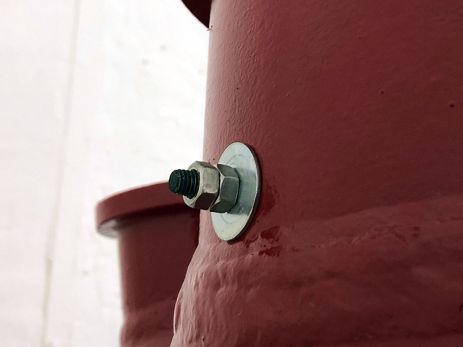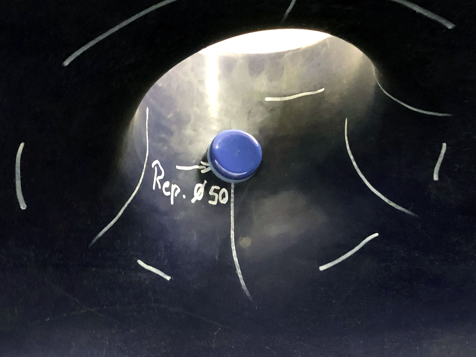 Die Abbildung zeigt eine reparierte Stelle in einem Stutzen DN 200. Der mit dem hoch chemisch beständigen und verschleißfesten THALETEC ABRISIST emaillierte Reparaturelement „RW“ deckt einen Schaden mit einem Durchmesser von ca. 20 mm ab. Die Befestigung des Reparaturelements erfolgt mit einer Verschraubung auf der Außenseite des Behälters. Damit ist die Montage schnell und einfach möglich. Auch das Nachziehen der Dichtung kann jederzeit von außen ohne das Öffnen oder das Einsteigen in den Behälter erfolgen.