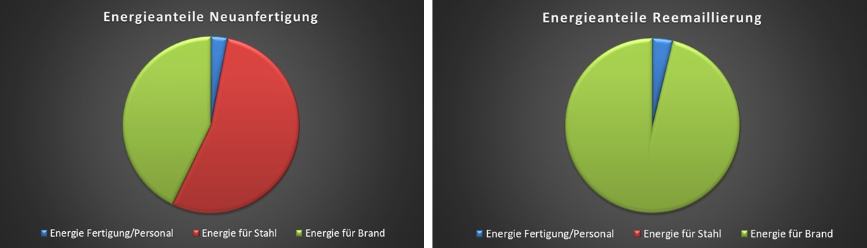 In Summe ist für eine Neuanfertigung des CE16000 ein energetischer Aufwand von rd. 131.300 kWh erforderlich. Dem gegenüber steht die Alternative einer Reemaillierung mit rd. 58.400 kWh. Dies entspricht einer Energieeinsparung von -55 %. Diese wird vorwiegend durch das Einsparen der Energie für die Stahlherstellung begründet.