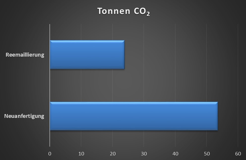 Dieser gravierende Unterschied spiegelt sich ebenso im CO2-Footprint wider. Unter der Annahme des deutschen Strommixes im Jahr 2019 (0,408 kg/kWh) [4] werden für die Neuanfertigung eines CE16000 rd. 53,6 t und für die Reemaillierung rd. 23,8 t Kohlenstoffdioxid emittiert (Abbildung 3).