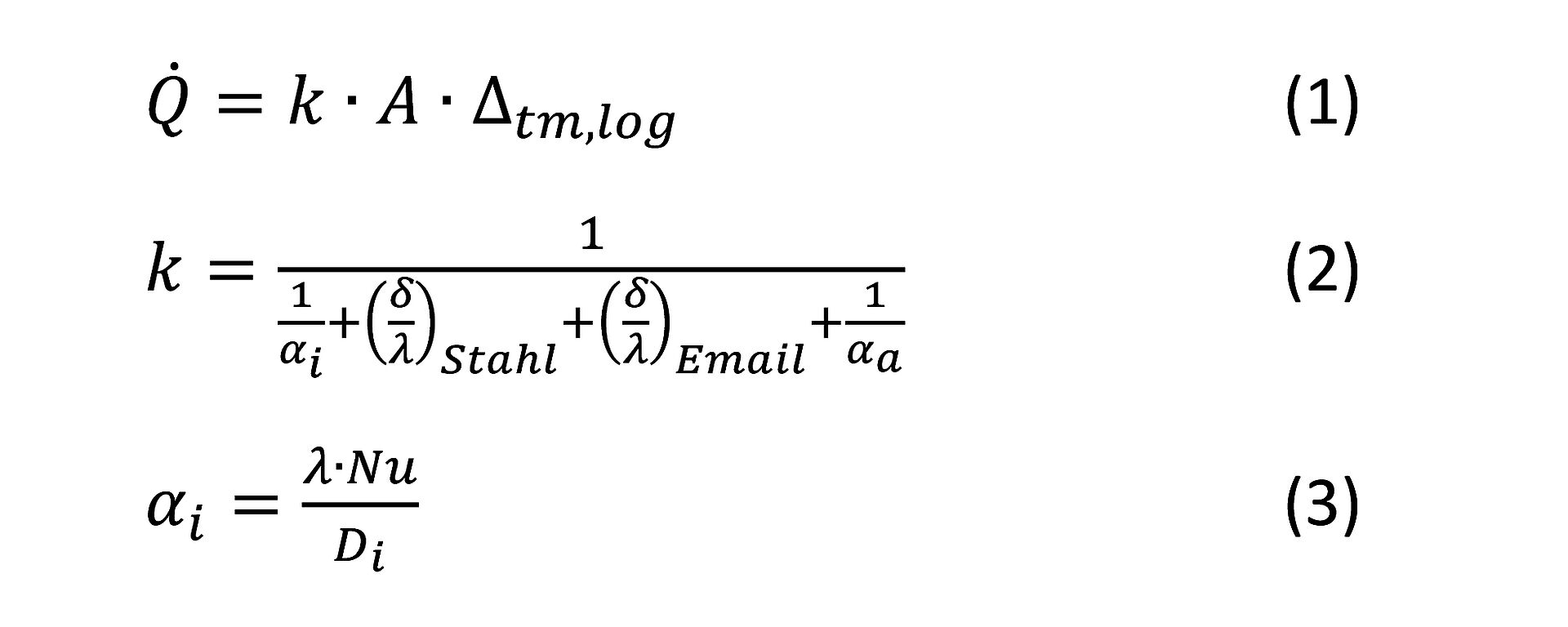 Zur Bestimmung des Wärmestroms (1) des Doppelmantels bzw. der Halbrohrschlange sowie des PowerBaffles (Abbildung 1) ist jeweils der Wärmedurchgangskoeffizient (2) zu bestimmen und mit der Wärmeaustauschfläche sowie der logarithmischen Temperaturdifferenz zu multiplizieren.