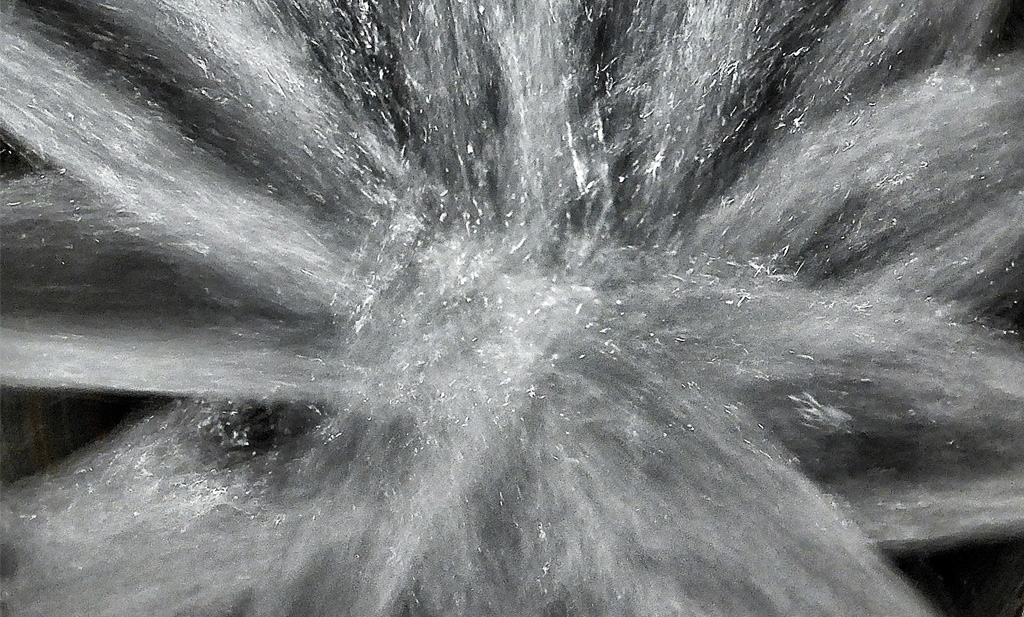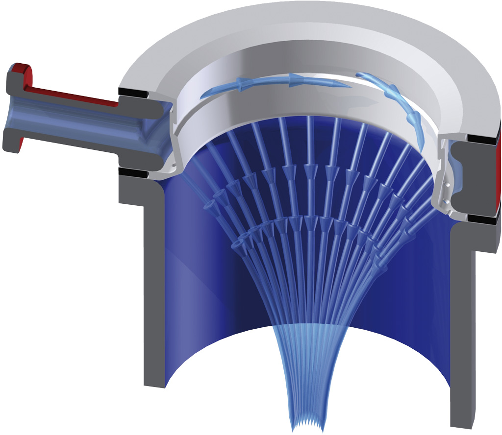 Ein Düsenring mit einem in vielen Versuchen optimierten Düsen-Design erzeugt ein definiertes Sprühmuster. Dabei vereinigt sich eine Vielzahl von einzelnen Flüssigkeitsstrahlen im Hals des Behälterstutzens zu einem Flüssigkeitsstrahl, der sich als „Kegel“ im Wesentlichen in der Mitte des Behälterstutzens ausbildet.